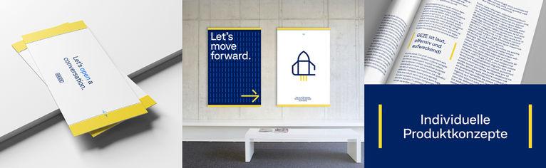Frames heben wichtige Headlines hervor. Diese können sowohl mit einem Bild kombiniert werden, als auch für sich alleine stehen. Die Farbe der Frames auf Headline-Ebene ist immer GEZE Gelb. Nicht jede Headline ist zwangsläufig in den Frames zu setzen. Es ist darauf zu achten die Frames nicht inflationär einzusetzen. Sie highlighten gezielt die allerwichtigsten Botschaften.